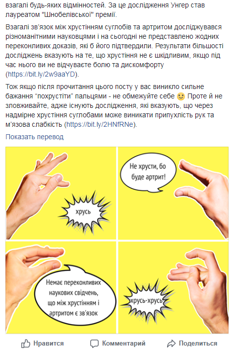 Многие люди любят иногда похрустеть пальцами рук. Вот только большинство уверены, что такие действия могут привести к артриту. Ульяна Супрун в одном из своих постов заверила, что все это выдумки и хрустеть можно сколько захочется.