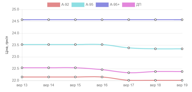 Средняя цена на топливо в Днепропетровской области А-95+ - 24.57, А-95 – 23.34, А-92 – 22.01, ДП – 22.38, Газ – 11.93.