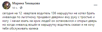Информация об очередном инциденте, связанном с вечным конфликтом водителей маршрутных такси и льготников, появилась сегодня в группе «12 Квартал Днепра». Как сообщила местная жительница Марина Тимашова, опубликовавшая жалобу, водитель 126 маршрутки отказался везти инвалида со льготным удостоверением.