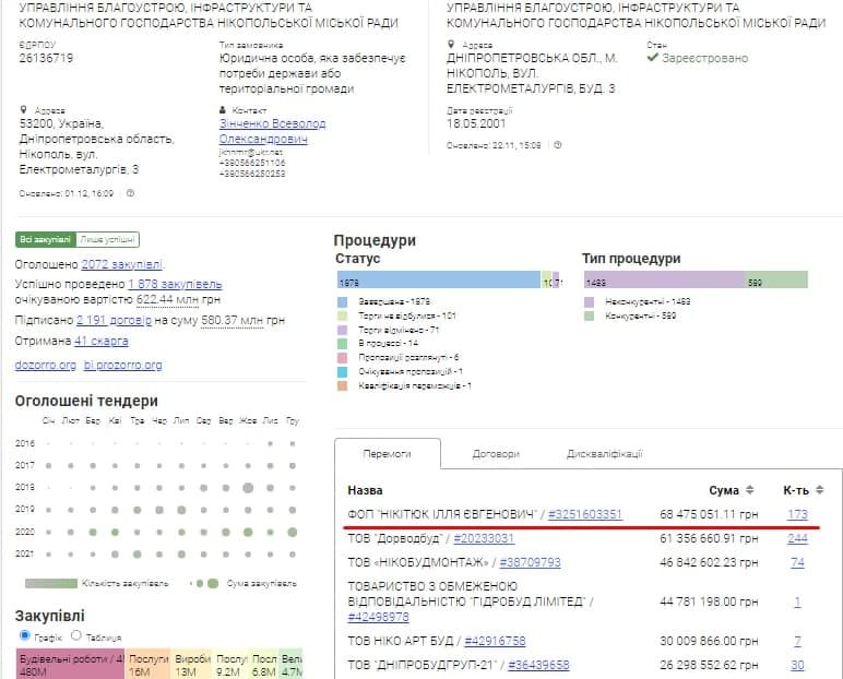 Один из любимых подрядчиков управления благоустройства, инфраструктуры и коммунального хозяйства Никопольского городского совета является ООО «Дорводбуд». По данным системы аналитики Сlarity Рroject, управление заключило с этой компанией 244 договора на общую сумму, превышающую 60 миллионов гривен.