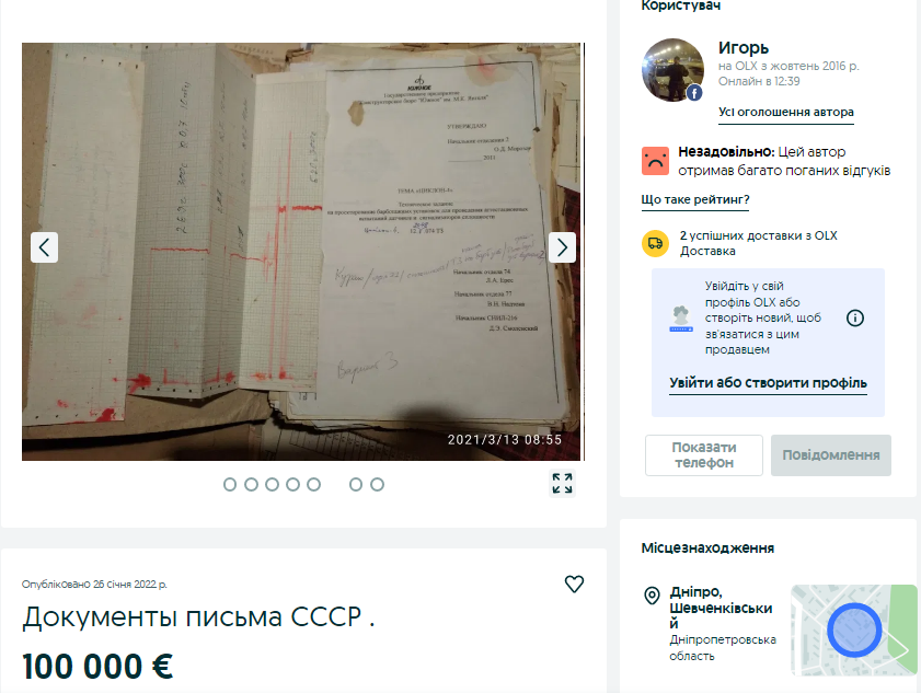 Продавец из Днепра предлагает купить документы и письма, которые принадлежат двум гигантам промышленности - Днепропетровскому машиностроительному заводу и КБ «Южное».