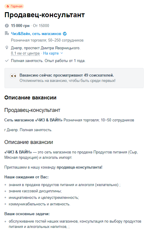 Продавец-консультант магазина, специализирующегося на определенных видах продукции в Днепре может заработать до 15 тыс грн. Чтобы получить эту работу – нужно знать кассовую дисциплину, быть коммуникабельным и активным человеком, среди основных задач не только консультирование клиентов, но и организация и проведение дегустаций, а также прием и выкладка товара в зале. Взамен, кроме зарплаты, работодатель предлагает официальное оформление и молодой и дружный коллектив.