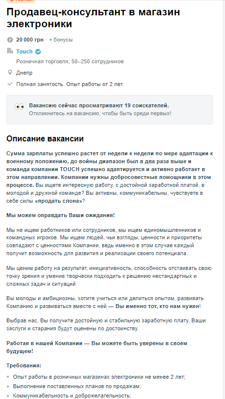 Еще больше – 20 тыс грн плюс бонусы можно заработать в Днепре продавая электронику в специализированном магазине. Среди требований опыт работы в схожих магазинах, выполнение поставленных планов по продажам, отсутствие вредных привычек. Из обязанностей: работа с клиентами, участие в переучетах, умение оформлять документы в программах учета. Работодатель предлагает гибкий график работы, оформление, и ежедневные бонусы от продажи дополнительных сервисов в магазине.