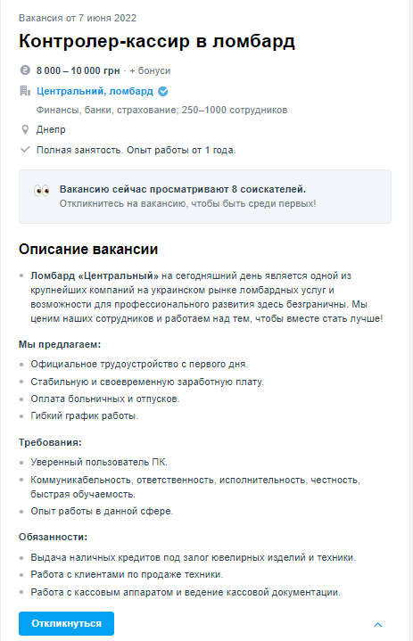 Контроллер – кассир в ломбарде Днепра может получать от 8 до 10 тыс грн плюс бонусы. С соискателя – уверенная работа за компьютером, коммуникабельность, исполнительность, честность и желателен опыт работы. С работодателя – официальное оформление, своевременная выплата зарплаты, гибкий график работы. На этой должности нужно будет выдавать наличные под залог ювелирных изделий и техники, в определенных случаях последнюю нужно будет продавать и уметь обращаться с кассовым аппаратом.