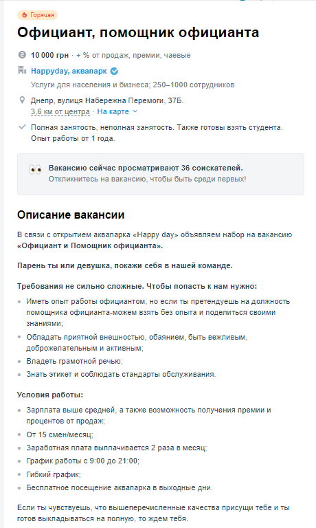 Примерно столько же можно получить в Днепре работая официантом или его помощником. Чтобы попасть на эту должность нужно «знать этикет и соблюдать стандарты обслуживания» а также «владеть грамотной речью». Предполагается, что нужно будет работать от 15 смен в месяц. Предполагается также, что клиенты будут оставлять официанту чаевые, поэтому это будет «бонусом» к зарплате в 10 тыс грн.