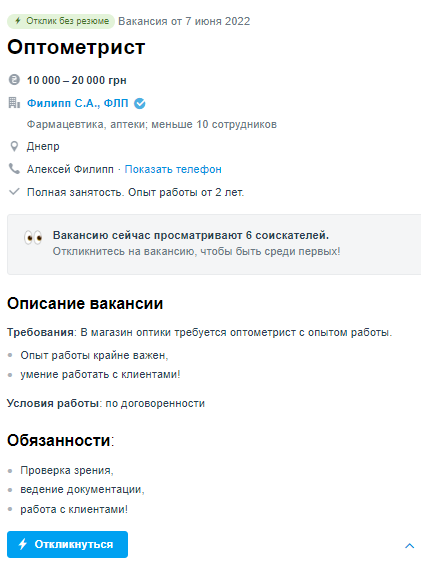 Оптометрист может получать от 10 до 20 тыс грн в Днепре. Работать нужно будет в магазине оптики. Условия работы – по договоренности, но опыт работы крайне важен. Также нужно умение работать с клиентами. Среди обязанностей: проверка зрения, ведение документации.
