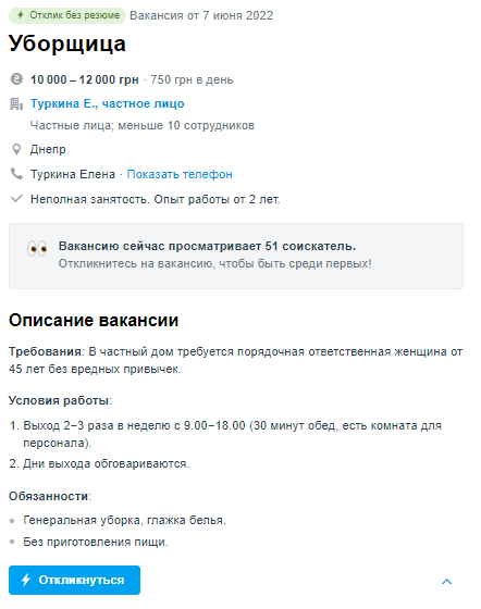 Чуть больше – от 10 до 12 тыс грн или 750 грн в день может заработать уборщица. Такой оклад предлагают в частном доме. Убираться нужно будет 2-3 раза в неделю с 9:00 до 18:00, при этом перерыв составляет полчаса. Среди обязанностей генеральная уборка, глажка белья. Дни работы обговариваются.