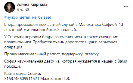 Сейчас за жизнь Сони борются врачи детской областной больницы на Космической. У подростка серьезный перелом бедра и сильная черепно-мозговая травма и смещение позвоночника. Для ее спасения необходима дорогостоящая операция, а после ее проведения - длительный реабилитационный период, на который также понадобятся немаленькие средства.