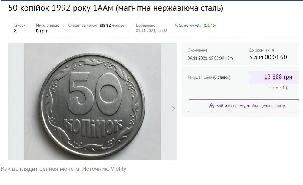 Продавец установил стартовую цену за редкую монету в 504,44 доллара США или 12 888 гривен. Стоит отметить, что подобные денежные знаки 1992 года выпуска зачастую продают гораздо дешевле, в среднем по 4 тысячи гривен. Однако сравнительно низкую цену просят за денежные знаки, которые побывали в обращении и имеют специфические царапины и потертости на поверхности. Почти за 13 тысяч гривен продается монета, которая выглядит как новая.