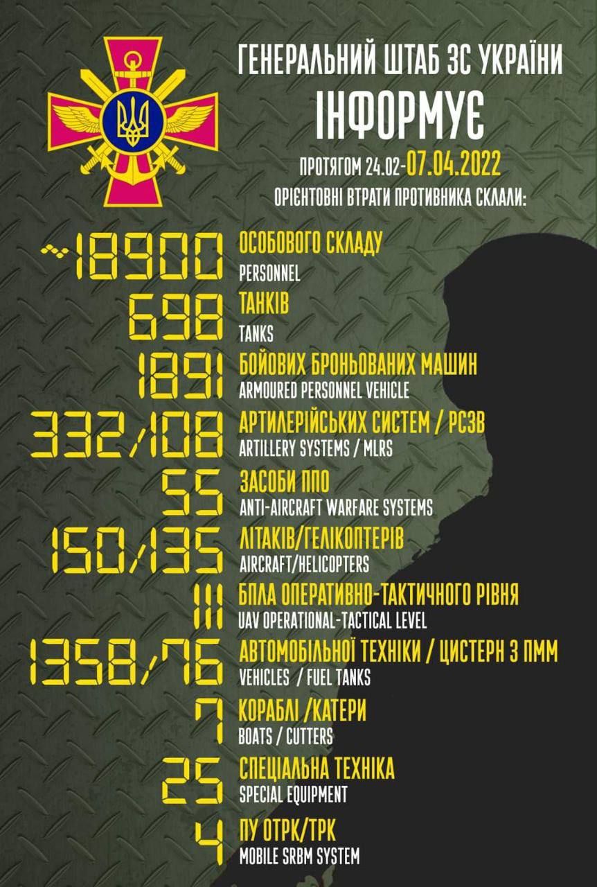 Общие боевые потери противника с 24.02 по 7.04 ориентировочно составили: