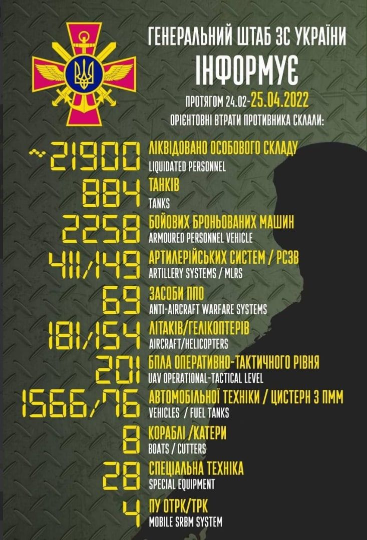 Общие боевые потери противника с 24.02 по 24.04 ориентировочно составили: