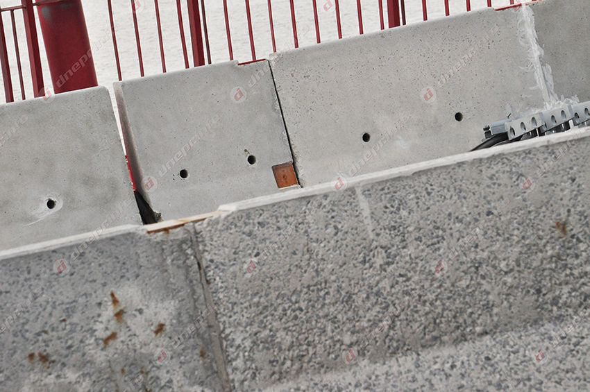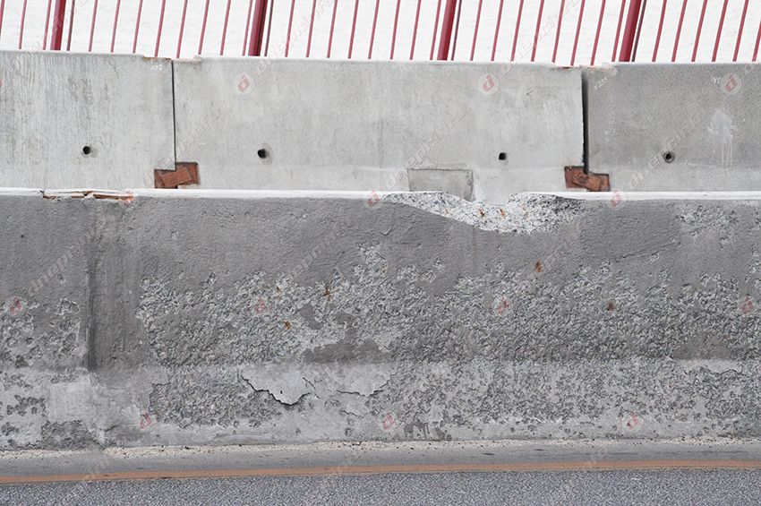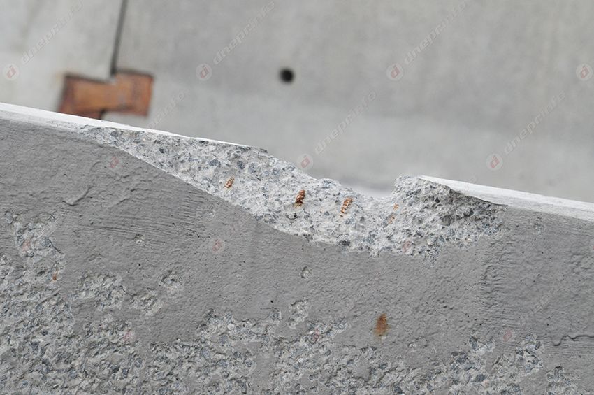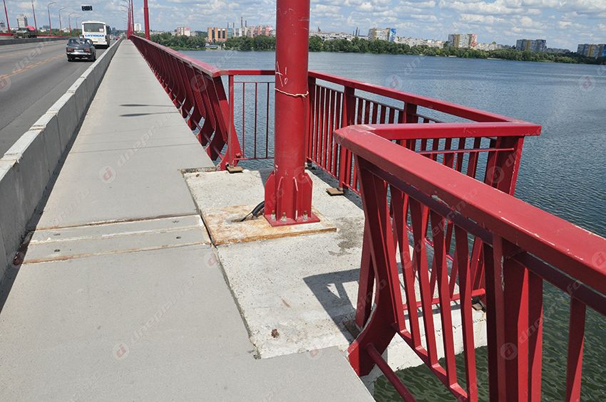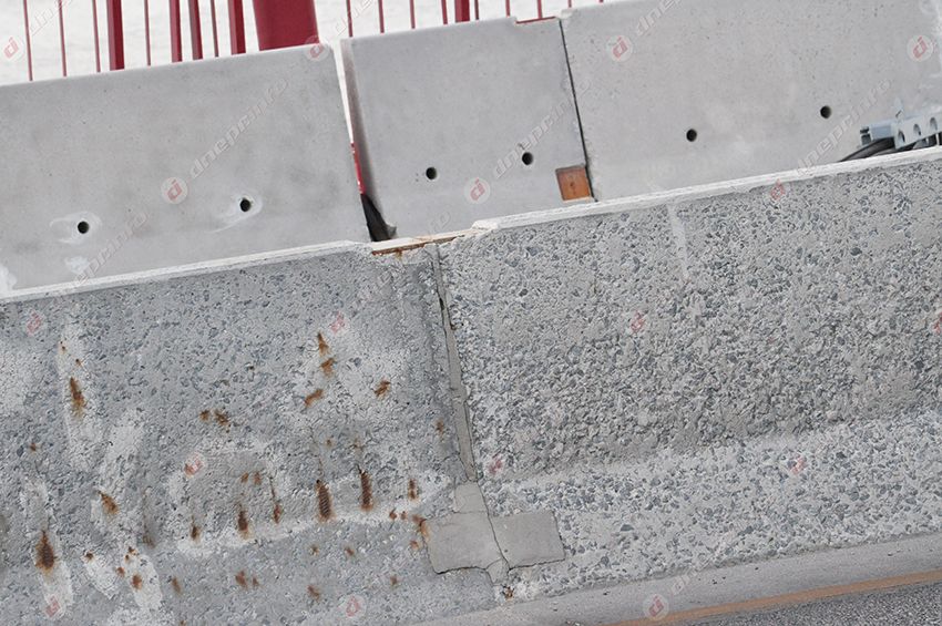 В одном месте в центральной части моста на бетонном отбойнике и вовсе имеется большой скол сверху.
