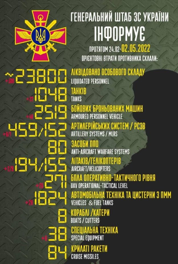 По состоянию на 2 мая потери врага составляют 23 800 человек. Кроме того, наши защитники уничтожили 1048 танков, 194 самолета и 2519 боевых бронированных машин оккупантов.