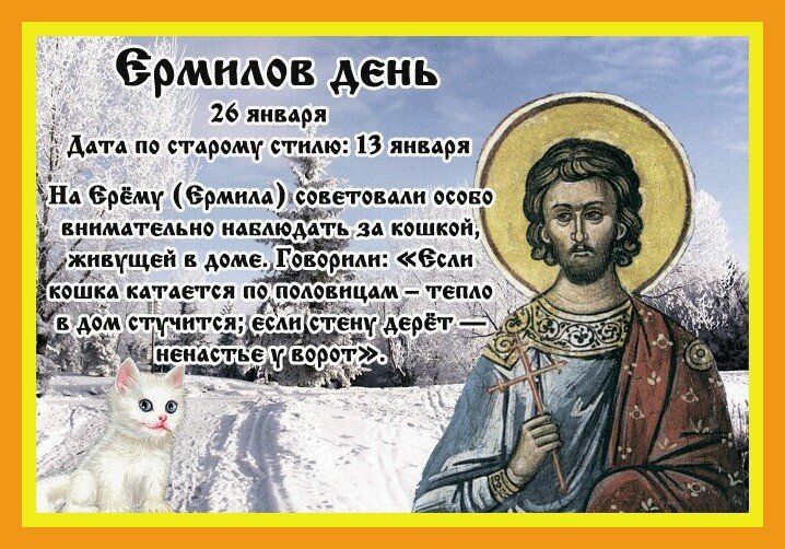 Ермилов день - народный и церковный праздник. В народе этот день получил название в честь церковной даты, установленной в память мучеников Ермила и Стратоника Синигидонских, живших в 3-4 веках. На Ерему советовали особо внимательно наблюдать за кошкой. Также у кошки можно было попросить и излечения от болезней.