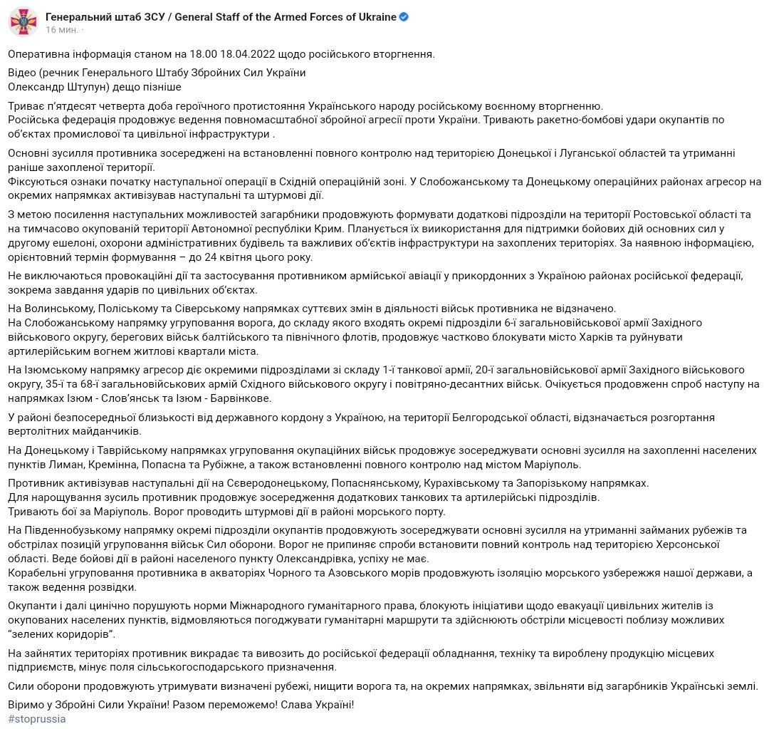 54 сутки войны: вечерняя сводка от Генштаба ВСУ