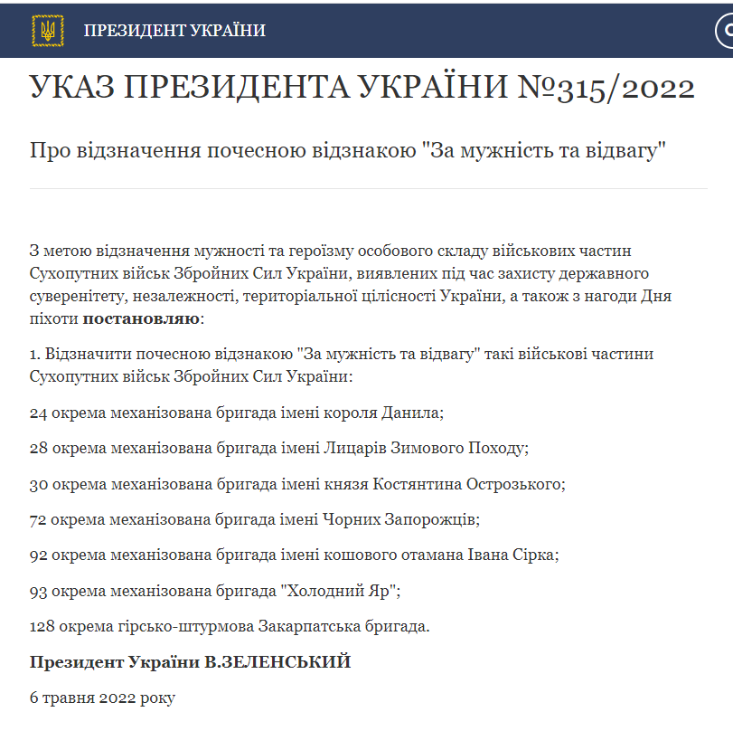 "С целью отмечания мужества и героизма личного состава воинских частей Сухопутных войск Вооруженных сил Украины, выявленных при защите государственного суверенитета, независимости, территориальной целостности Украины, а также по случаю Дня пехоты постановляю наградить почетным знаком "За мужество и отвагу", - говорится в указе президента.