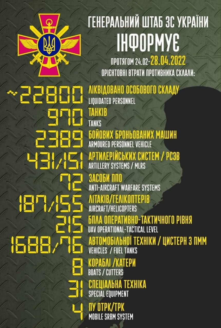 Общие боевые потери противника с 24.02 по 28.04 ориентировочно составили:
