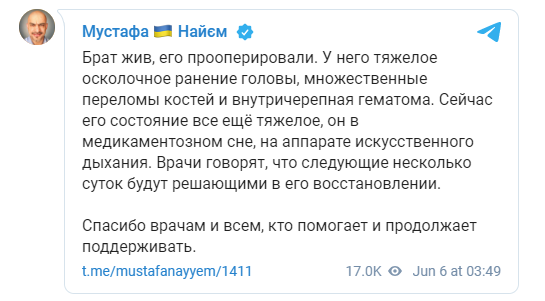 «Брат жив, его прооперировали. У него тяжелое осколочное ранение головы, множественные переломы костей и внутричерепная гематома», – написал Мустафа Найем.