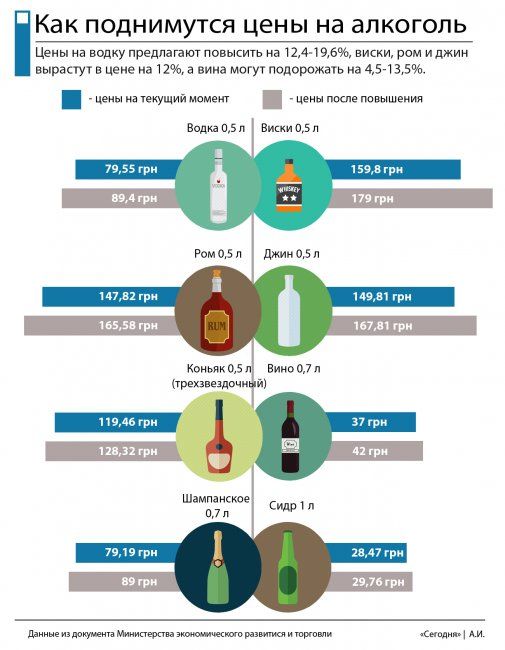 - Водка и ликеро-водочные изделия - 12,4%-19,6%. После этого цена скакнет до 89,4 гривен.