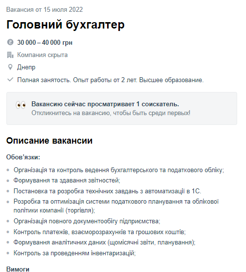 Від 30 до 40 тис грн на місяць може отримувати головний бухгалтер з досвідом роботи 2 роки. Потрібно буде організовувати та контролювати ведення бухгалтерського та податкового обліку, формувати та здавати звітність, ставити та розробляти технічні завдання з автоматизації в 1С, а також організувати повний документооборот підприємства.