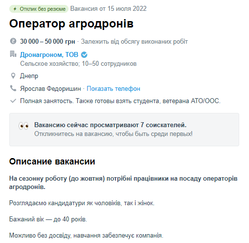 Майже стільки ж, від 30 до 50 тис грн на місяць може отримати оператор агродронів. Працювати потрібно буде на відкритій місцевості та постійно бути у відрядженнях. Серед вимог – наявність водійських прав категорії В, адже для пересування робітники дадуть авто компанії. Та робота сезонна, тільки до жовтня. При цьому досвід роботи з технікою не обов’язковий, обіцяють всьому навчити.