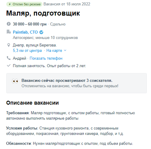 Від 30 до 60 тис грн може отримати на місяць автомаляр, що заразом буде готувати машини під фарбування. Серед вимог досвід роботи, серед умов роботи – сучасне обладнання, окремі камери для підготовки авто та фарбування.