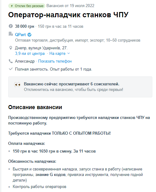 Наладчик станків ЧПУ у Дніпрі може отримувати до 38 тис грн на місяць. Головна вимога – досвід роботи та вміння швидко наладити запуск станка в роботу, тобто написати програму, знати коди та вміння «змусити» інструмент «видавати» деталь потрібного розміру та форми. Робота позмінна, по 11 годин за зміну.