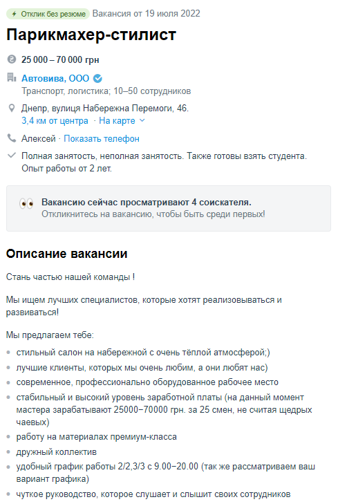 Перукар-стиліст може заробити за місяць у Дніпрі від 25 до 70 тис грн. Серед вимог: креатив та навики виконання дизайну, серед переваг, як зазначено дружній колектив, керівництво, яке може вислухати та почути своїх співробітників, сучасне обладнання та клієнтська база.