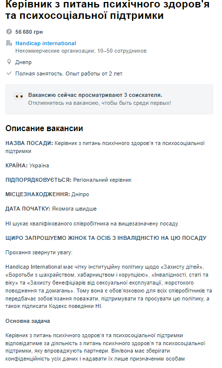 Керівник з питань психічного здоров’я та психосоціальної підтримки некомерційної організації у Дніпрі може отримати 56,6 тис грн на місяць. Серед необхідних компетенцій – наявність ступеня бакалавра або магістра психології та досвід понад 2 роки в якості роботи технічним спеціалістом із психосоціальної підтримки. Також необхідно мати досвід роботи в гуманітарних програмах як то польовий психолог. Серед особистих якостей в майбутньому працівникові хочуть бачити почуття гумору, здатність справлятись з тиском і стресом, терпіння, дипломатичність та «добре місцеве коріння».
