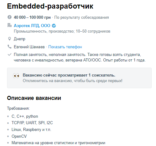 Embedded- розробник у Дніпрі може заробити від 40 до 100 тис грн на місяць. Працювати потрібно буде на промисловому виробництві. Серед вимог знання різноманітних мов програмування та знання математики на рівні статистики та тригонометрії.