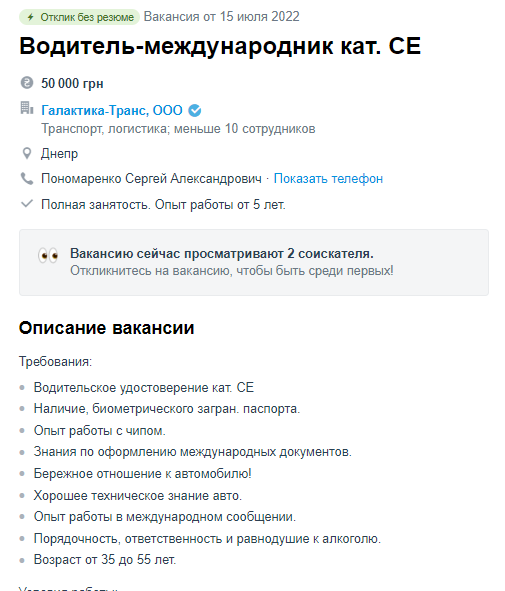 Водій-далекобійник може отримувати 50 тис на місяць. Серед вимог: водійське посвідчення категорії СЕ, наявність біометричного паспорта, досвід роботи з перевезення вантажів у Європу, знання технічної сторони авто та бережне до нього відношення.