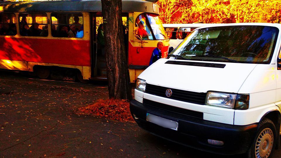 Сегодня днем, 30 октября, водитель микроавтобуса «Volkswagen Transporter» на улице Михаила Грушевского (бывшая Карла Либкнехта) припарковался в районе дома №26 так, что на полчаса заблокировал движение трамваев.