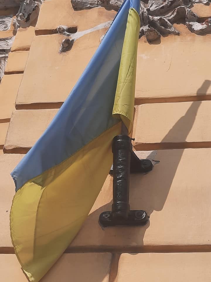 На административном здании зеленого цвета и на желтом выставочном убрали с флагштоков серп, молот и звезду. Символика времен СССР в Украине запрещена, начиная с 2014-15 годов, когда Верховная Рада приняла комплекс законов о запрете пропаганды коммунистической идеологии.