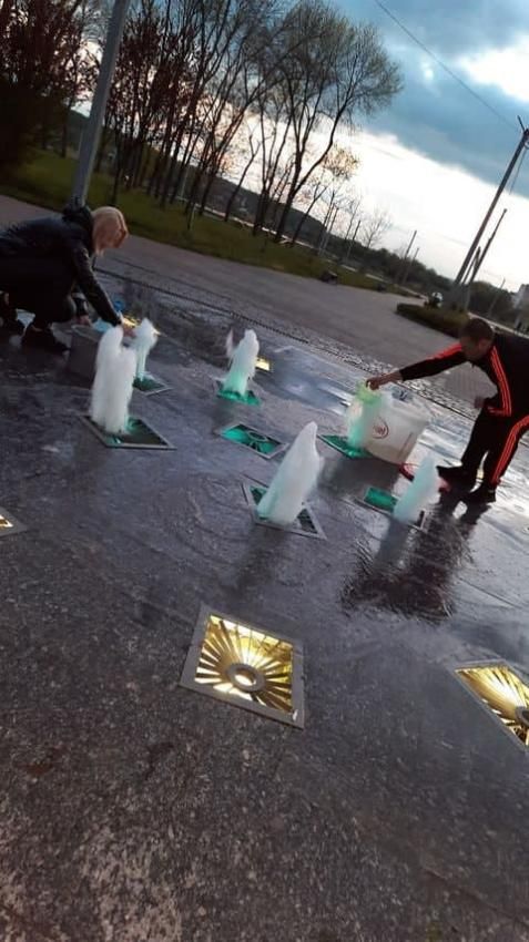 Еще молодые люди с ведрами пошли в парк и набрали воду из фонтана. В комментариях стали строить догадки, почему фонтан функционирует и откуда в нем вода.