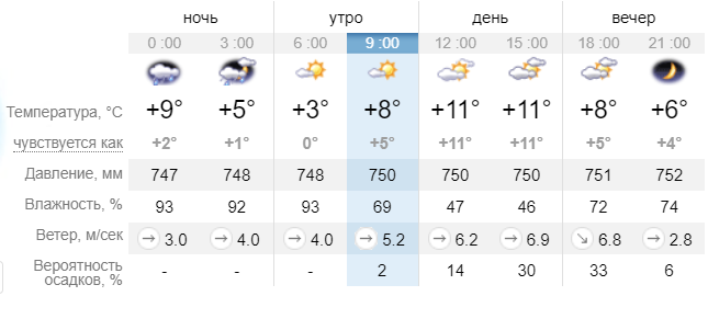 Температура воздуха днем 11 градусов тепла с отметкой плюс, вечером - 6-8 градусов выше ноля.