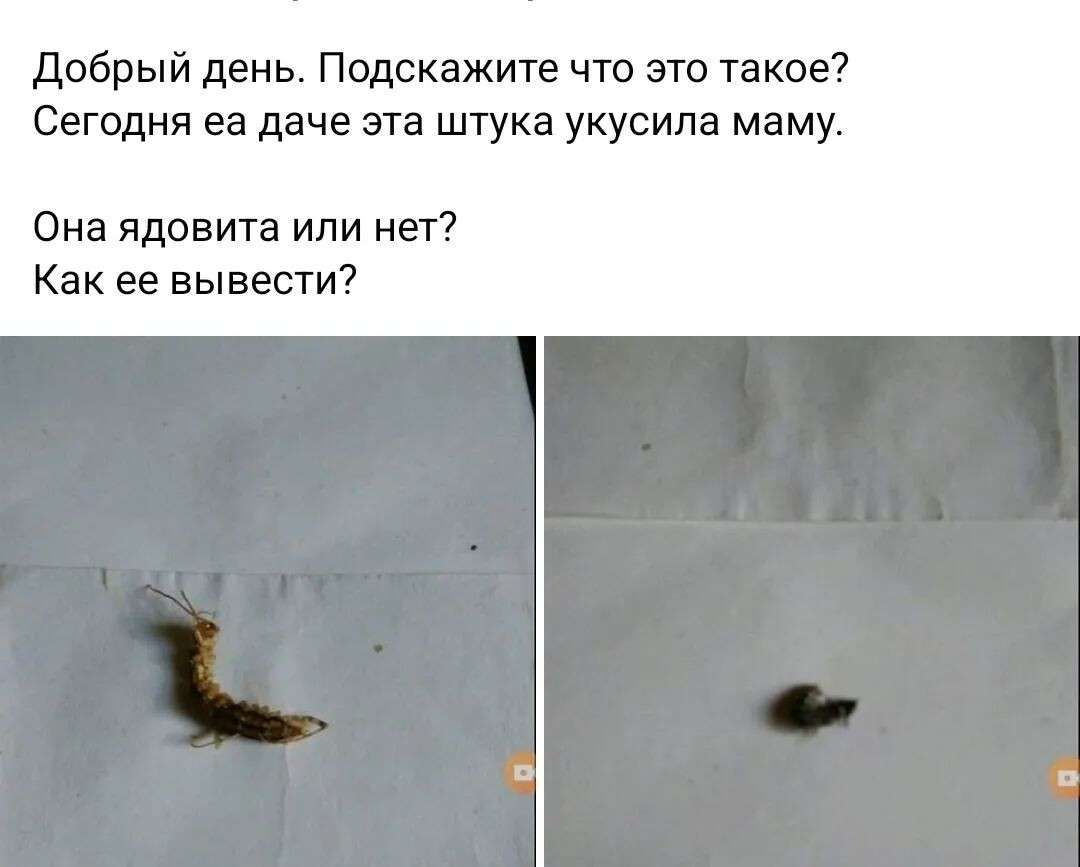 Так, местная жительница пожаловалась, что ее мать укусило неизвестное насекомое. Женщина обеспокоена тем, что оно могло быть ядовитым. Сам автор публикации в группе отмечает, что это - сороконожка, хотя, судя по фото, насекомое похоже на сколопендру. Они действительно могут укусить человека.