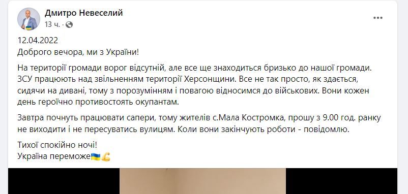 Так, 13 апреля начиная с 9:00 жителей поселка Мала Костромка просят не выходить и не передвигаться по улицам. Саперы будут обезвреживать взрывоопасные предметы, которые остались после обстрелов. О том, когда можно будет безопасно выходить из своих домов - сообщат дополнительно.