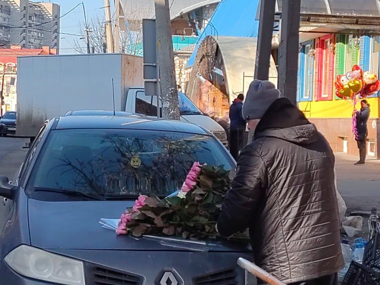 Торговля идет, но не очень бойко. Мужчины покупают от 5 роз. Продавцам товар регулярно подвозят, фасуют и распаковывают его прямо на капоте авто, а потом расставляют по вазам с водой.