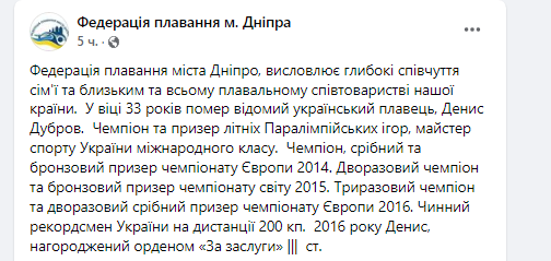 "Федерация плавания города Днепр выражает глубокие соболезнования семье и близким, всему плавательному сообществу нашей страны. В возрасте 33 лет скончался известный украинский пловец Денис Дубров", - говорится в сообщении.