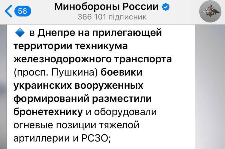 Учора пізно ввечері міністерство оборони росії заявило, що в одному з технікумів Дніпра українські військові начебто розмістили бронетехніку, артилерію і РСЗВ.