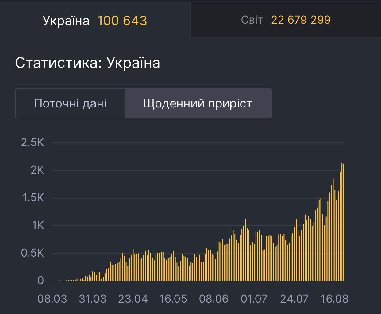 Как сообщили в Министерстве здравоохранения Украины, за сутки 20 августа число выявленных случаев инфицирования коронавирусом все так же превышает 2 тысячи. На утро 21 августа их количество составляет 2 106 человек. Более полутысячи, а точнее - 637 пациентов выздоровели. Количество летальных исходов также, как и ранее не опускается ниже 20 человек. сегодня их 23.
