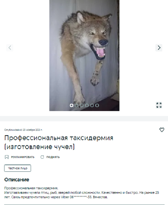 В Днепре также можно изготовить чучело убитых на охоте птиц, зверей, выловленных рыб, а возможно и домашнего любимца. Цена в каждом индивидуальном случае оговаривается отдельно.