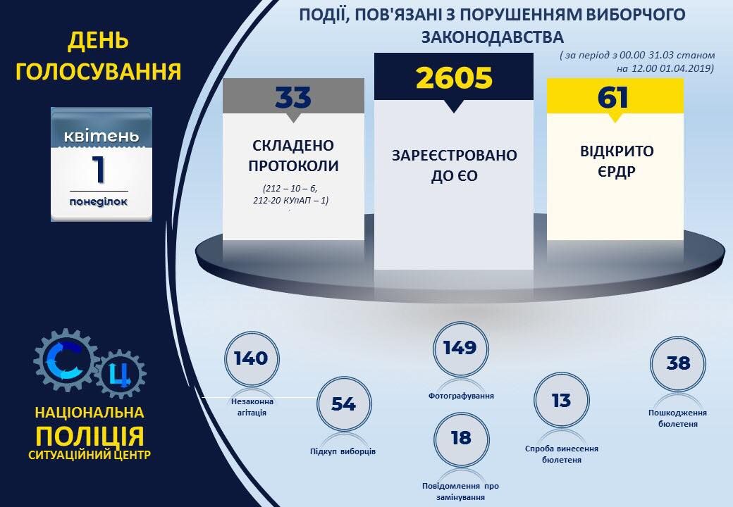 Правоохранители опубликовали информацию о количестве нарушений в стране с начала президентских выборов. Данные актуальны на 12:00 1 апреля. Всего по стране полицейскими было получено 2 605 сообщений о нарушениях, которые связаны с избирательным законодательством.