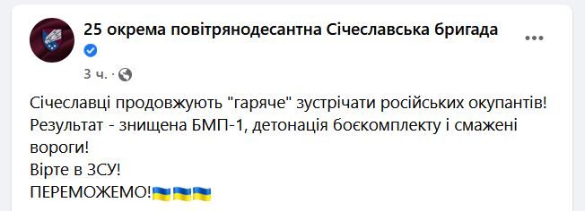 Об этом рассказали на фейсбук-странице 25 отдельной воздушнодесантной Сичеславской бригады