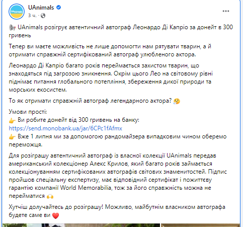 Зоозащитная организация UAnimals разыгрывает аутентичный автограф Леонардо Ди Каприо за пожертвование в 300 гривен.