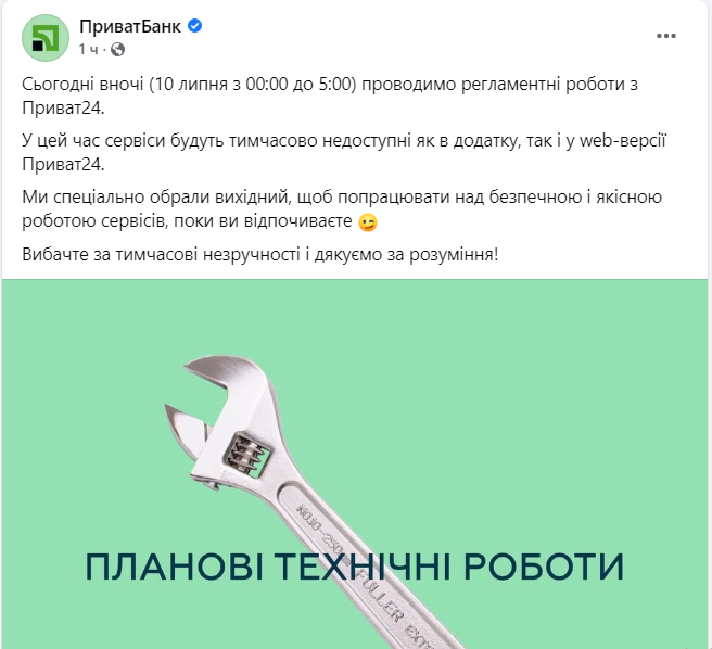 "Сегодня ночью (10 июля с 00:00 по 5:00) проводим регламентные работы с "Приват24". В это время сервисы будут временно недоступны как в приложении, так и в web-версии "Приват24". Мы специально выбрали выходной, чтобы поработать над безопасной и качественной работой сервисов, пока вы отдыхаете. Извините за временные неудобства и благодарим за понимание!" - говорится в сообщении банка.