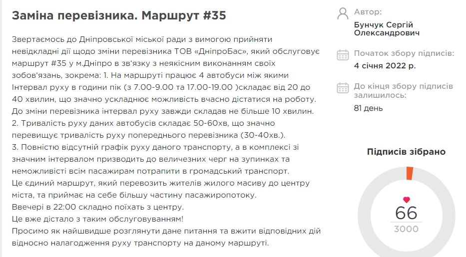 Днепрянин Сергей Бунчук опубликовал на сайте Днепровского горсовета петицию, в которой просит сменить перевозчика на маршруте №35, который ходит из Приднепровска в центр. Сейчас услуги предоставляет компания «Днепробас». Мужчина жалуется на то, что сейчас на линии работает только 4 машины, между которыми огромный интервал движения. В часы пик приходится ждать по 20-40 минут.