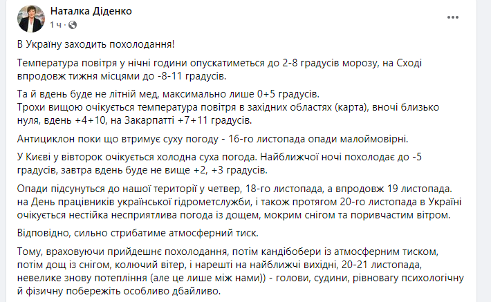 На выходных слегка потеплеет, но не надолго. Также Наталка Диденко просит в эти дни следить за своим здоровьем, ведь скачки температуры могут негативно сказаться на психологическом и физическом состоянии.