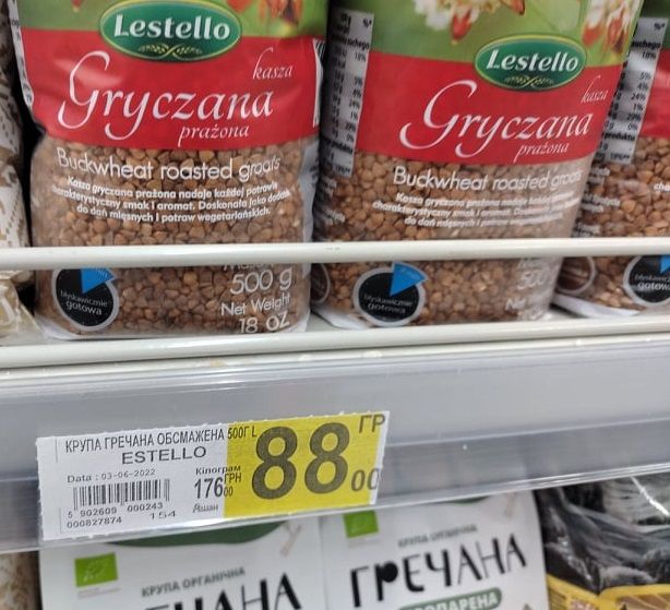 Обычную гречку на прилавках найти сложно, но вот органическую – пожалуйста. Правда за «органическую» нужно будет доплачивать, потому что такая крупа подразумевает, что ее выращивали без удобрений, в экологически чистом районе. Она украинского производства. Продают ее расфасованной по 800 грамм в упаковке и просят за это почти 132 грн, то есть кило гречки обойдется почти в 165 грн.