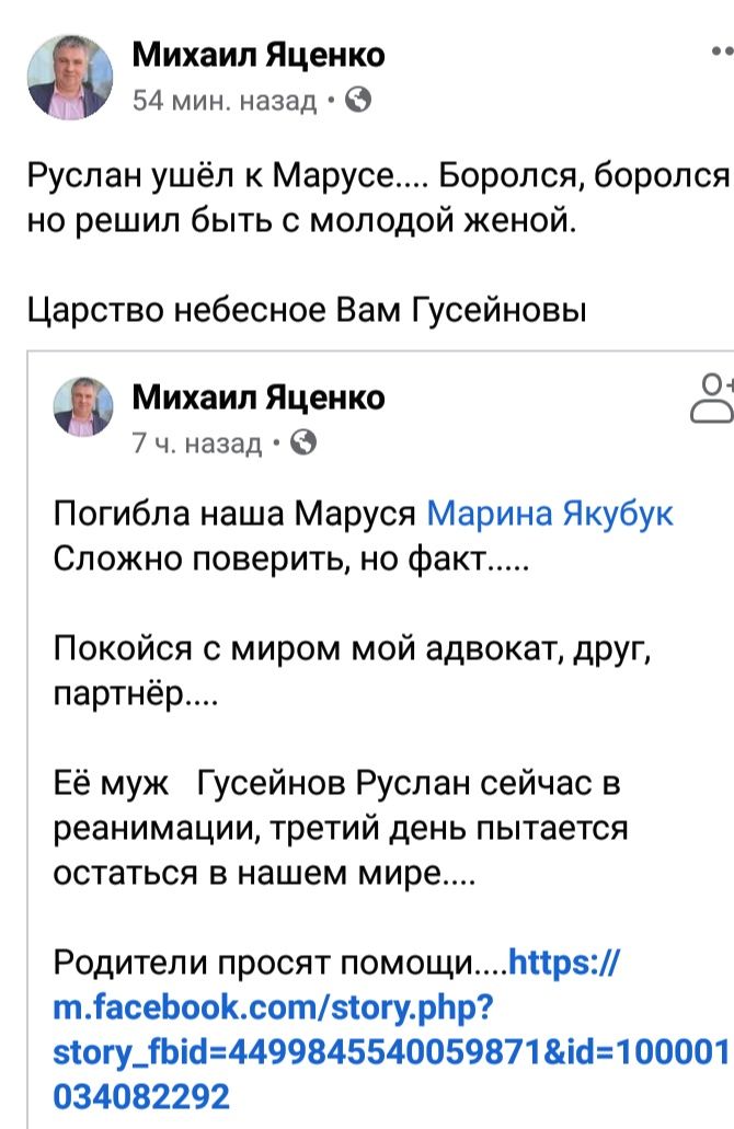 Супруга Руслана, Марина Гусейнова, погибла на месте сразу после ДТП. Девушка работала адвокатом. Прощание с Мариной прошло сегодня в Спасо-Преображенском кафедральном соборе.